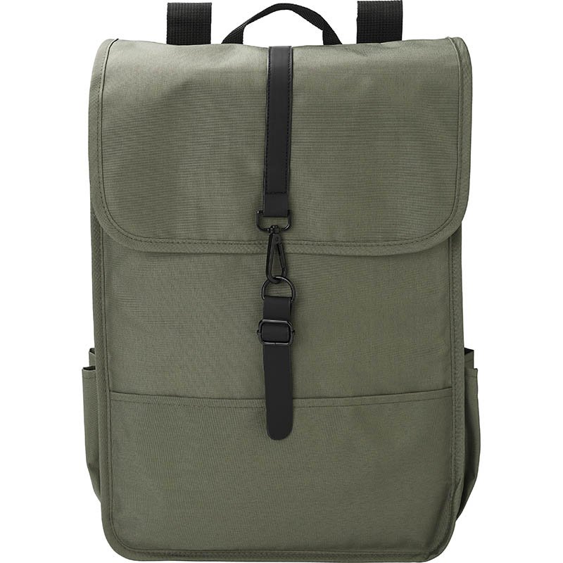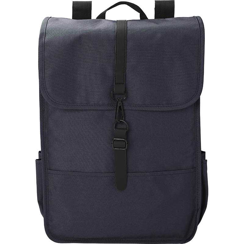 RPET Polyester (300D) flap backpack. Two bottle pockets on the side. One large compartment. With black PU strap with closing buckle.