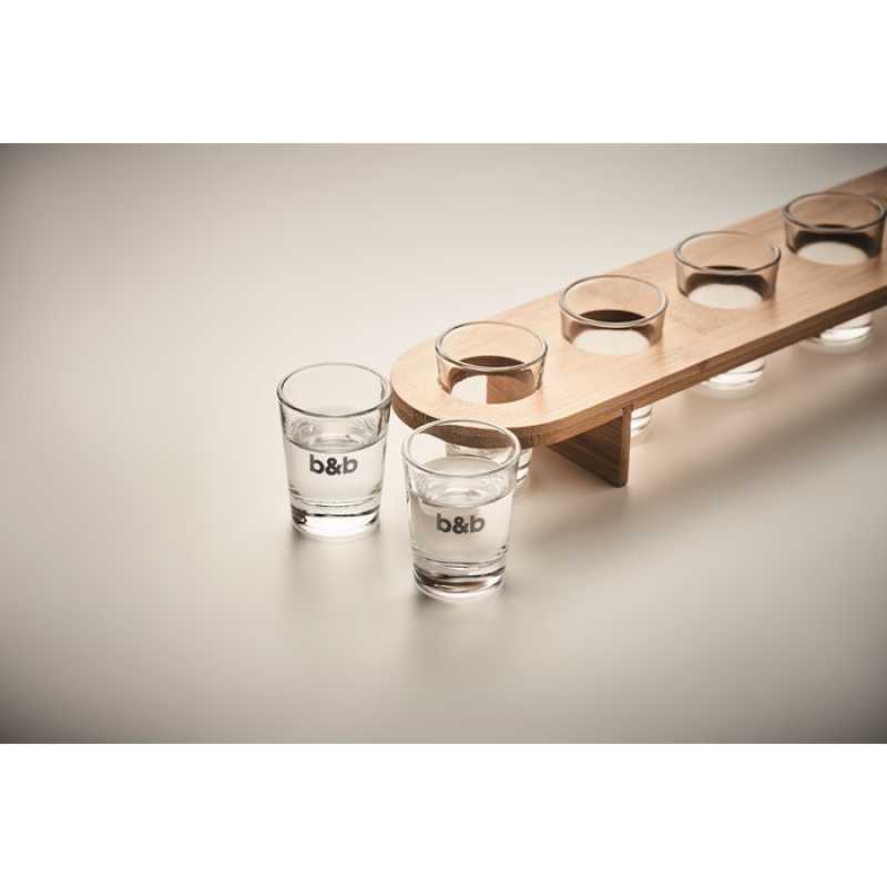 Sada 6 panákových skleniček na bambusovém podnosu ve tvaru pádla. Objem: 20 ml. Bambus je přírodní materiál, může dojít k mírným změnám barvy, dekorace a velikosti.