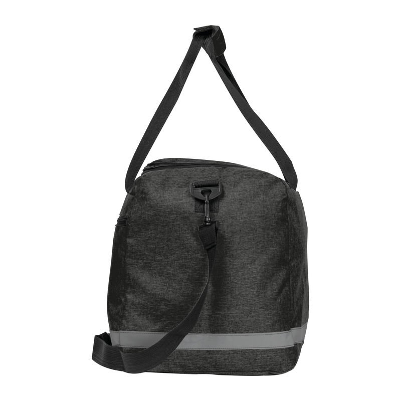Polyester (600D) sports bag with a zippered compartment and adjustable carry strap.