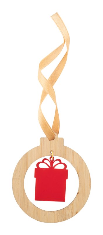 Ozdoba na vánoční stromeček z bambusové překližky a akrylu se zlatou oddělenou stuhou.