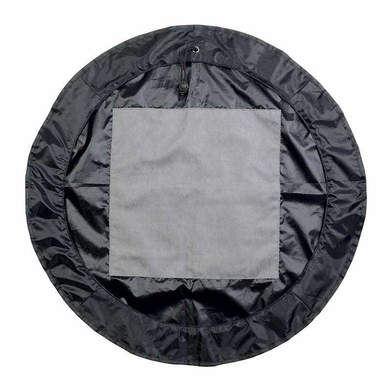Polyester foot mat. Can be folded and turned into a bag for damp clothes (65 cm diameter when opened, 16 x 11 x 3 cm when closed)