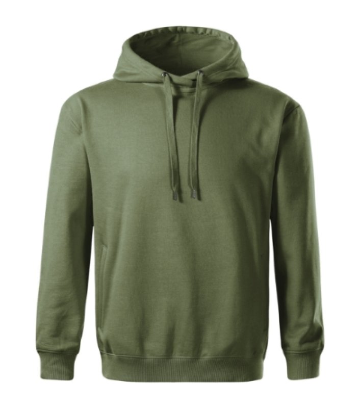 rovný střih s bočními švy, kapuce s podšívkou, na stažení šňůrkou, vnitřní část průkrčníku začištěna páskou v barvě vrchového materiálu, nakládaná kapsa ve stylu klokanky, dolní lem a manžety rukávů z žebrového úpletu 2:2 s 5 % elastanu, vnitřní strana po