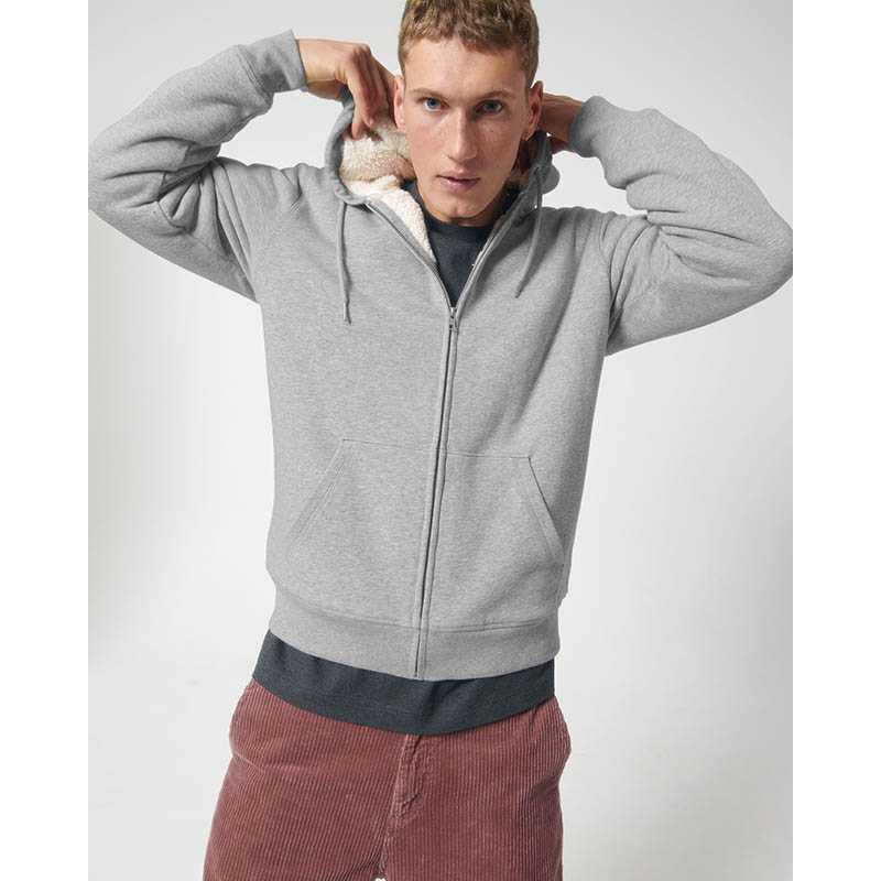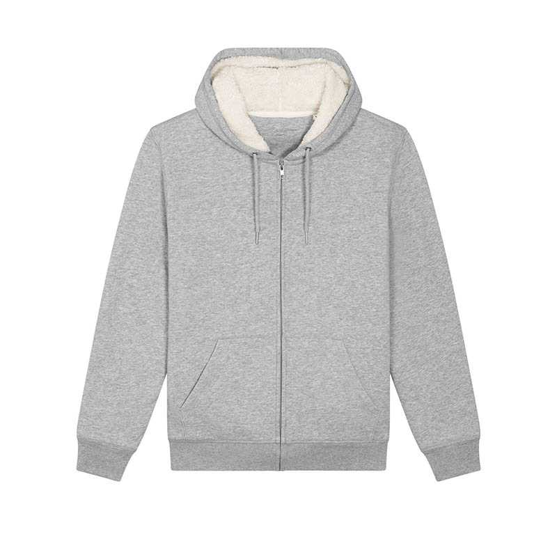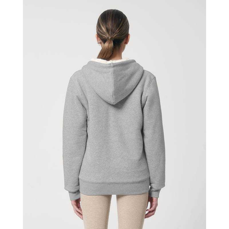 Set-in sleeve Lined hood in recycled sherpa Round drawcords in matching body colour with metal tipping Metal eyelets Inside herringbone back neck tape in greige colour Self fabric half moon at back neck Covered metal zip at center front 1x1 rib at sleeve