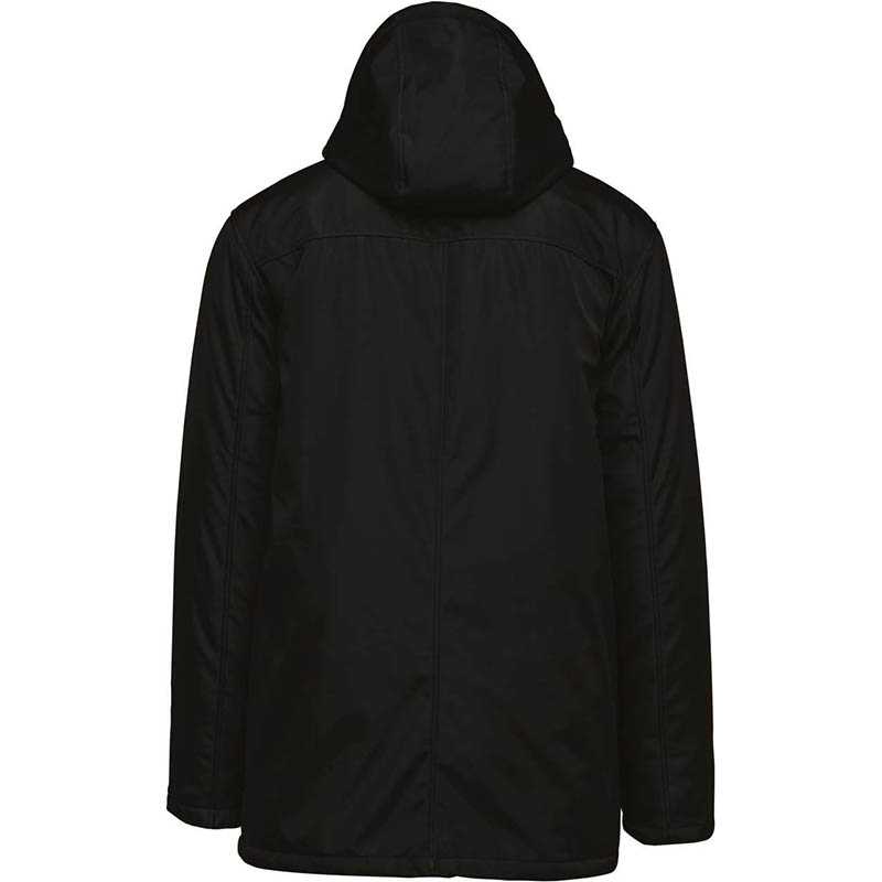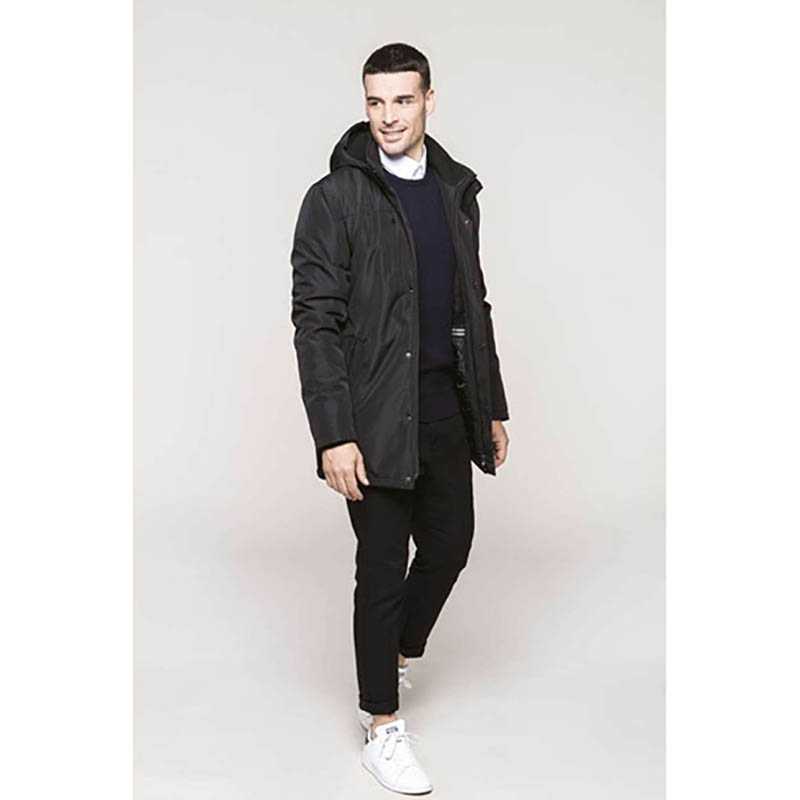 Business zateplený kabát v pěkném designu.Vodě a větru odolný (5 000 mm vodní sloupec.Paropropustnost je 1 500 g/m2/24hod.Stojací límec, nastavitelná a odepínatelná kapuce.Hlavní zip je překryt klopou.2 přední kapsy, 2 šité kapsy na prsou a jedna vnitřní