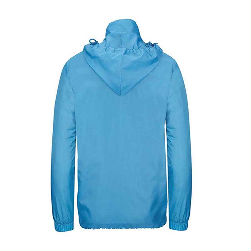 UNISEX Windbreaker. Taffeta. 100% Polyester. 70 g/m2 Water repellent Concealed hood in collar. Foldable on itself in pocket Full front zipper with puller 2 zipped side pockets To