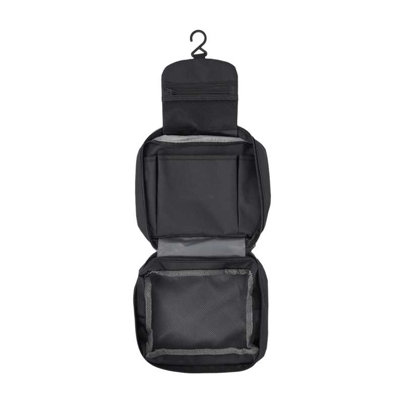 Polyester (210D) ripstop travel toiletry bag with hanging hook. Zippered pouch on topside when opened. One large and one small zippered mesh pocket. Pouch on backside. Short carrying handle.