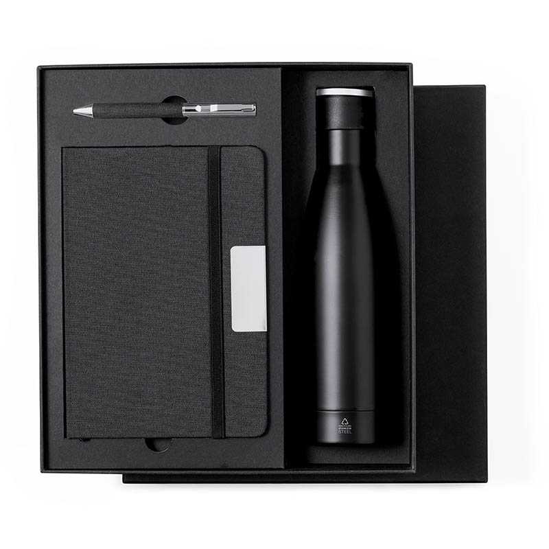 NOVINKA 2025. Stylish premium set. Including: 500 ml capacity,double-layer flask made in Recycled Stainless Steel with matte black finish, and rigid handle in matte silver metal. With stainless steel logo.RPET notepad in an elegant black colour, with a special metal late for laser engraving. Including elastic closure and fabric bookmark. Interior with 80 sheets of single-striped layout. With RPET logo.RPET ball pen with matt black finish, twist mechanism and blue ink. With clip and polished metal tip. Set presented in an individual matte-finish case, with inner die cut for each of the elements of the set.The RPET material is made from recycled plastic, promoting the reuse of plastic waste and helping the sustainability of the planet.
