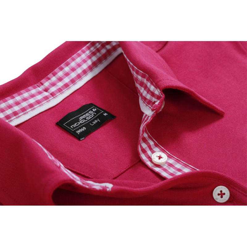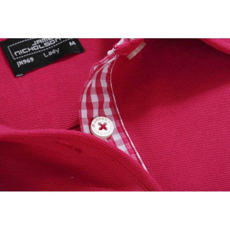 Dámské polo.Módní čtverečkovaný pruh pod knoflíčky ve výstřihu a kolem krku.Velmi jemné piqué.4 knoflíčky.Balení: 1/50 . (ks v jednom sáčku / celkem ks v kartonu)