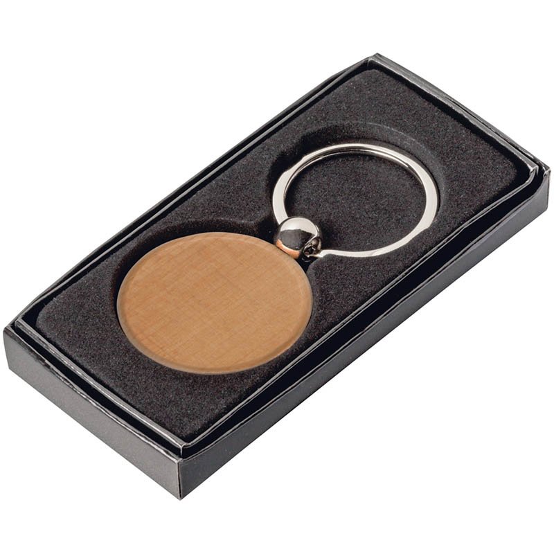 Round, solid beech wooden keychain with sturdy keyring. Each piece in a box.