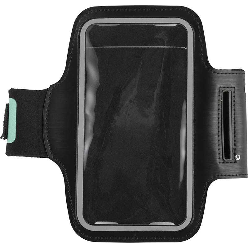 Obal na mobil na paži z PU kůže s dotykovým okénkem a reflexními částmi. Vhodný pro mobily do rozměru 6 palců.