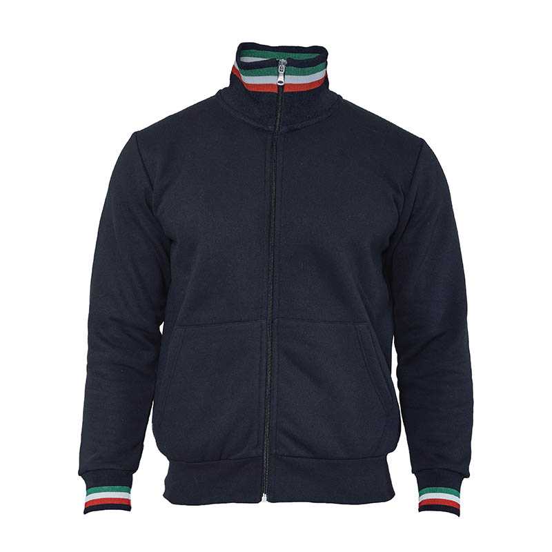 ECOLOGICAL SWEATSHIRT MADE IN ITALY 50% regenerated cotton – 50% recycled polyester - Long zip - Tricolor on the neck (internal and external) and on the cuffs - Mock neck - Internal neck reinforcement tape - Two kangaroo pockets - Collar, cuffs and bottom of the shirt in elastic rib