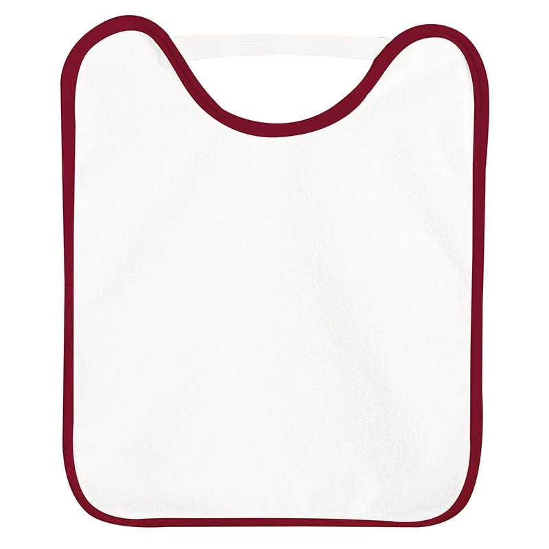 Baby Bib with Elastic Back. Made with a double layer fabric: a smooth poplin layer that allows for easy printing and an absorbent towelling layer that effectively retains and soaks up liquids. Elasticated band for easy fastening at the nape of the neck. Ribbed seams all around for added strength and durability. Suitable marking methods: screen printing, transfer printing, vinyl application. Ideal as a personalised gift, daily use, merchandising, souvenir, and more.
