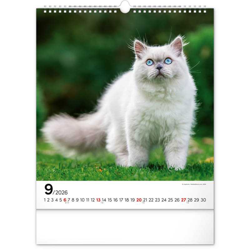 Poznámkový kalendář s hravými a roztomilými koťaty, se kterými byste se nejraději pomazlili. Uvnitř najdete přehledné kalendárium od září 2025 do prosince 2026 v šesti jazycích, měsíční fáze, důležité svátky a prostor pro poznámky na každý den.
