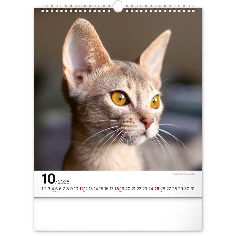 Fotografie osobitých koček na stránkách oblíbeného nástěnného kalendáře s univerzálním kalendáriem na bílém pozadí.