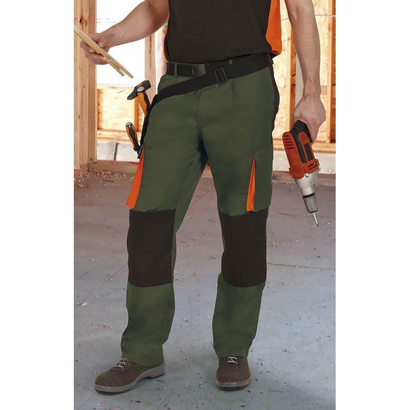 Two-Tone and Three-Tone Multi-Pocket Work Trousers.Made of a sturdy cotton twill fabric blended with polyester for strength and durability.Button-and-zipped flap fastening, back elasticated waistband, belt loops and front darts for a comfortable fit and a better adjustment.Contrasting colour back and knee pad with top access for easy attachment of knee protectors (optional).Two slanted hip pockets, two side gusseted velcro flap cargo pockets, a right back patch pocket for a secure and convenient storage, and showcase the branding.Suitable marking methods: screen printing, embroidery, transfer printing, vinyl application.Ideal as workwear and uniforms.