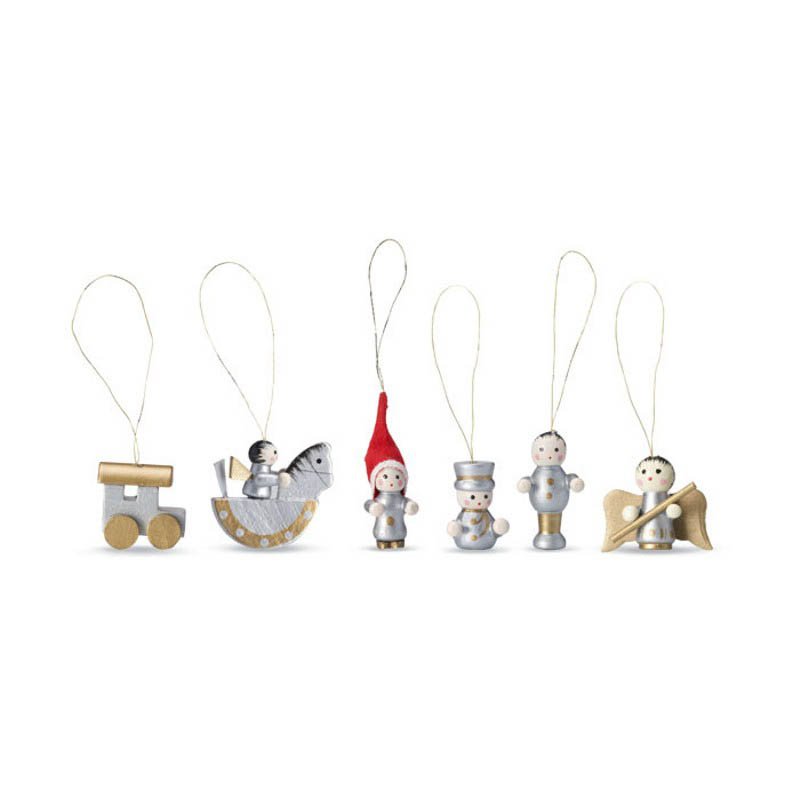 Sada 6 dřevěných vánočních ozdob v kartonové krabici s víkem.