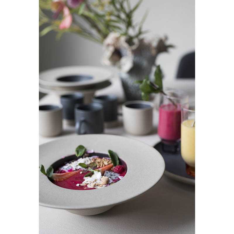 Sweden meets Japan in this new and innovative porcelain series. A collection limitless in the ways you can combine its individual parts. And it’s because of this that Fumiko will surprise you every time you set a table – if it’s in a luxurious restaurant, in a café or in your own home – its timeless yet super-trendy design and stylish aura will create an inviting and welcoming effect. SOUP PLATE FUMIKO - The artistic way of serving a soup. Machine-washable porcelain in beige and black. Porcelain.