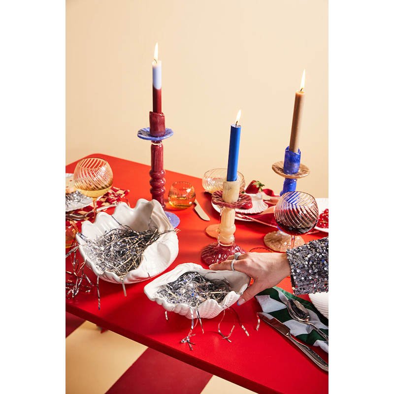 Extravagant, pompous, and absolutely wonderful perfectly describe the Lara candlesticks in handmade glass. No candlestick speaks for itself as well as Lara, taking its rightful place in every home. The Lara candlestick is inspired by the columns that adorn many of the fantastic Italian houses, majestic and often with rounded forms. The base and top resemble a flower, catching the dripping wax like a built-in cuff holder. Available in different heights and colors, they can be combined for maximum effect but stand out just as well on their own. The material is glass, reminiscent of the glass art of the past. Available in three sizes and three color combinations. Handmade. Variations in color and texture may occur. Designed by Byon Studio. Delivered in a Byon box. Material: Mouth-blown glass Weight: 900 g Width: 120 mm; Height: 260 mm; Length: 120 mm Color: niebieski Technique Comment: Handmade, variations in color and texture may occur.