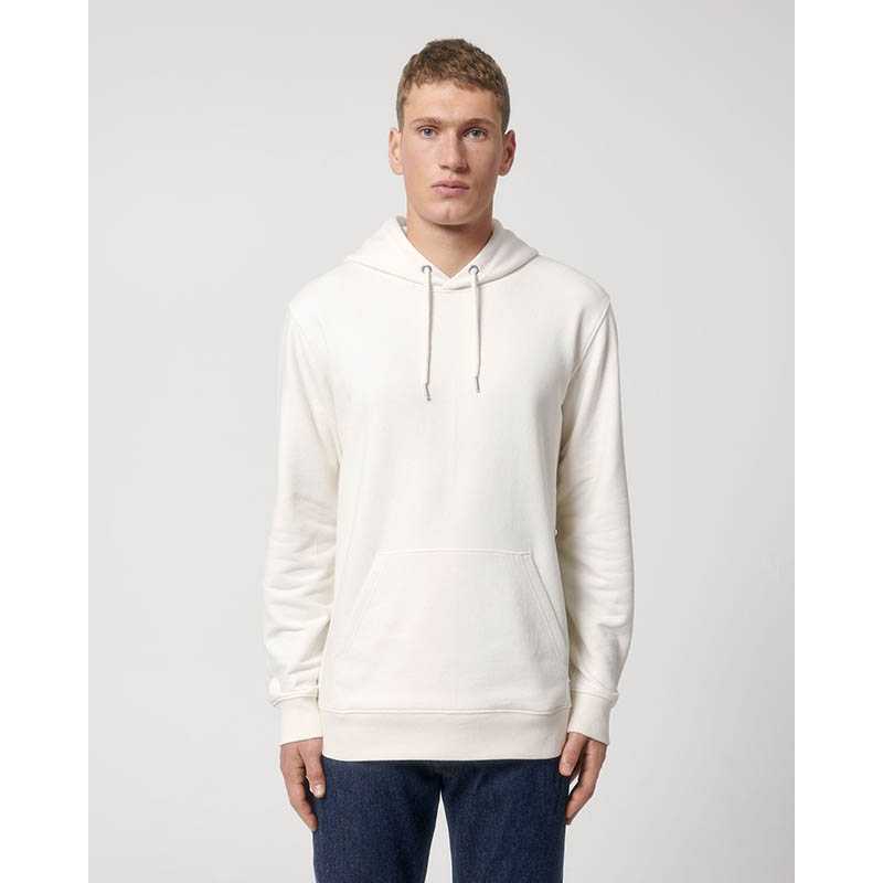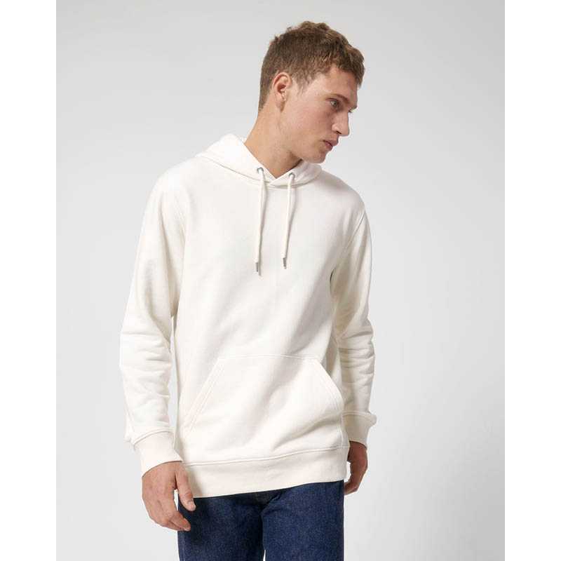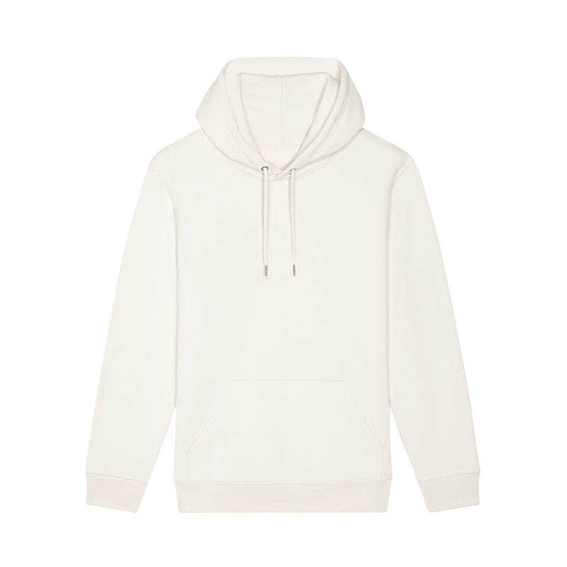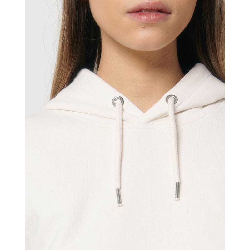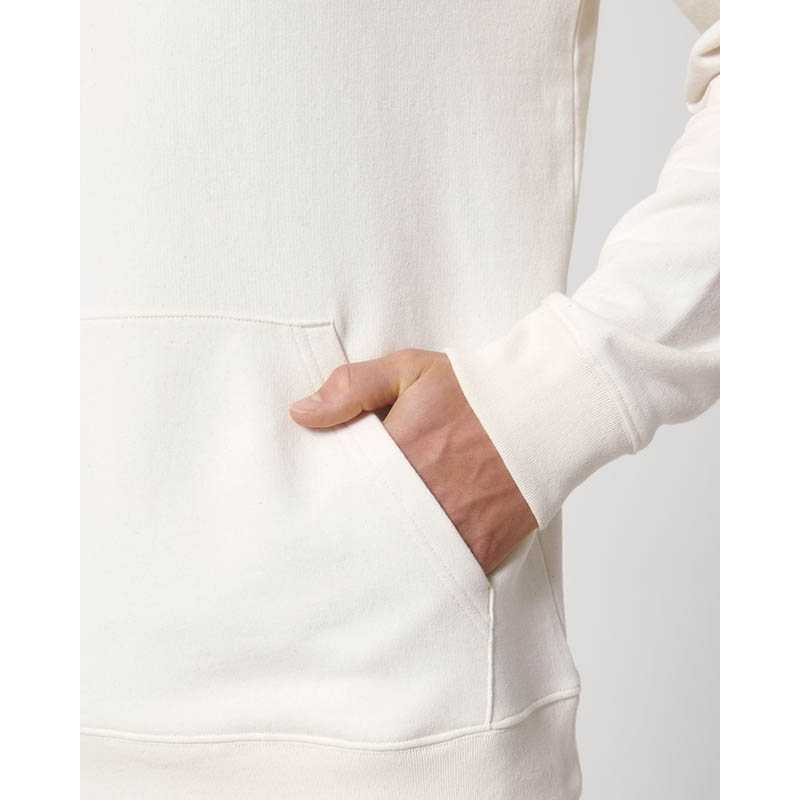 Made from in-house organic cutting waste Set-in sleeve Double layered hood in self fabric Round drawcords in matching body colour with metal tipping Metal eyelets Inside herringbone back neck tape Self fabric half moon at back neck Single needle topstitch