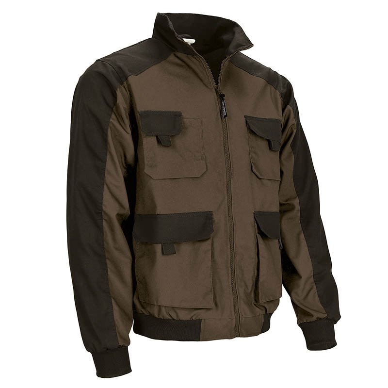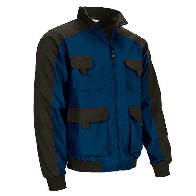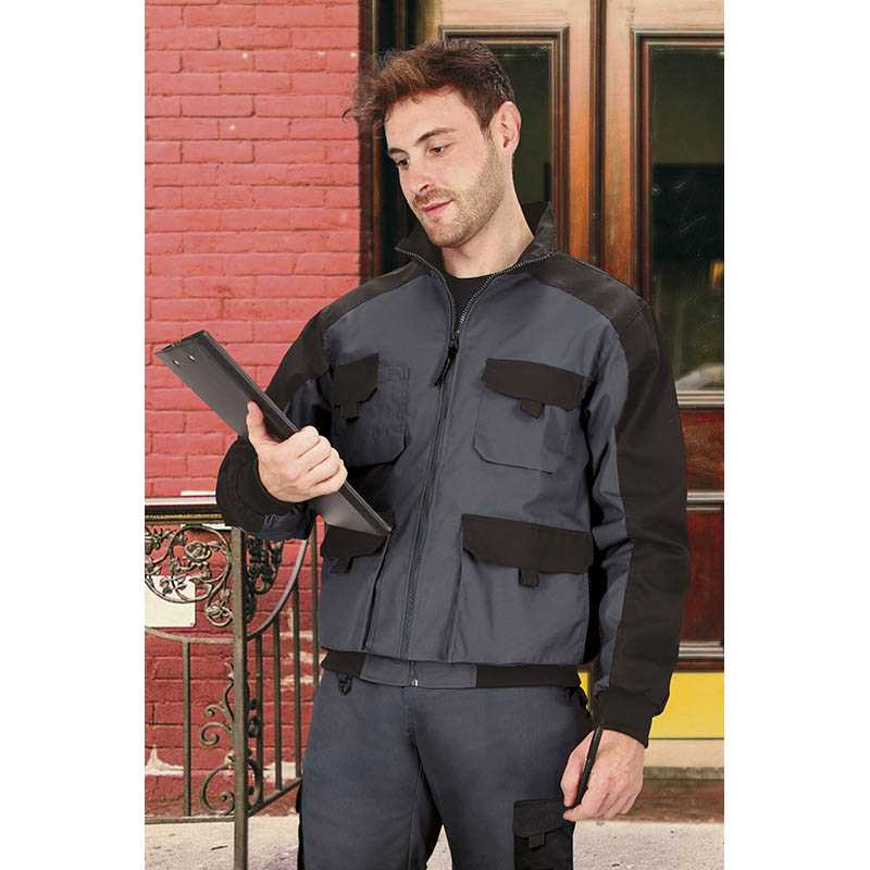 Two-Tone Work Jacket.Made of cotton blended with polyester Canvas fabric for strength and durability, with water-repellent finish for extra comfort. Stand-up collar with full-zip front closure for effortless functionality and practicality.Elasticated waistband and cuffs for comfortably fitting. An inner velcro pocket, two front gusseted pockets and side slits leading to two more pockets, an upper left pocket, a right one for accessories and two pen holders, all four with velcro flap closure and a puller for easy opening, anti-puncture system for a secure and convenient storage.Includes an inside back zip for easy marking with different methods: screen printing, embroidery, transfer printing, stitching, vinyl application. Ideal as workwear and uniforms, pairs well with DYNAMITE work trousers.