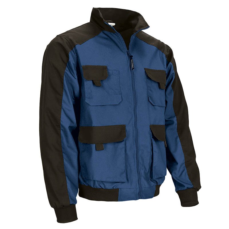 Two-Tone Work Jacket.Made of cotton blended with polyester Canvas fabric for strength and durability, with water-repellent finish for extra comfort. Stand-up collar with full-zip front closure for effortless functionality and practicality.Elasticated waistband and cuffs for comfortably fitting. An inner velcro pocket, two front gusseted pockets and side slits leading to two more pockets, an upper left pocket, a right one for accessories and two pen holders, all four with velcro flap closure and a puller for easy opening, anti-puncture system for a secure and convenient storage.Includes an inside back zip for easy marking with different methods: screen printing, embroidery, transfer printing, stitching, vinyl application. Ideal as workwear and uniforms, pairs well with DYNAMITE work trousers.