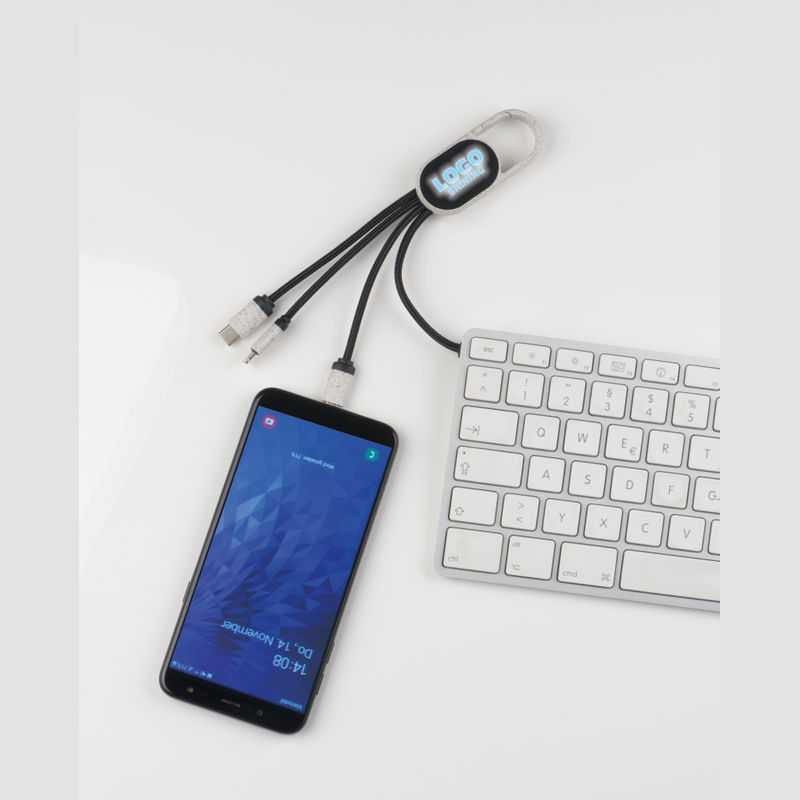 Nabíjecí kabel 3v1 z materiálu s obsahem pšeničné slámy, USB nabíjecím kabelem, Micro USB, C-Type a 8 pinovým konektorem. Logo bude v průběhu nabíjení svítit. Zpsůob potisku gravírování.