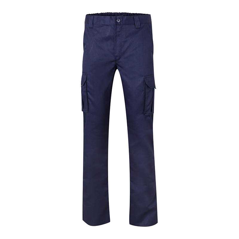 Front zip with button Elastic waistband Double safety seam Darts Six pockets: 2 French pockets 2 patch pockets with bellows, cover flaps and Velcro 2 back pockets with bellows, cover fl