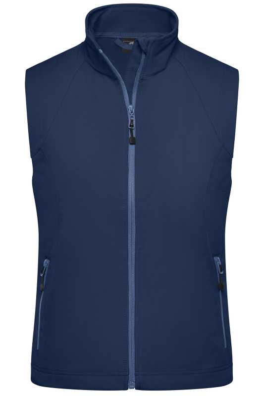 Módní dámská softshellová vesta James & Nicholson.Vyrobená z 95% polyesteru a 5% elastanu..Funkční 3-vrstvy tkaniny s PU membránou - větru odolná, prodyšná a vodě odolná (5.000 mm vodního sloupce) .Lehce zúžená, uvnitř mikro fleece, vnitřní síťovina v pře