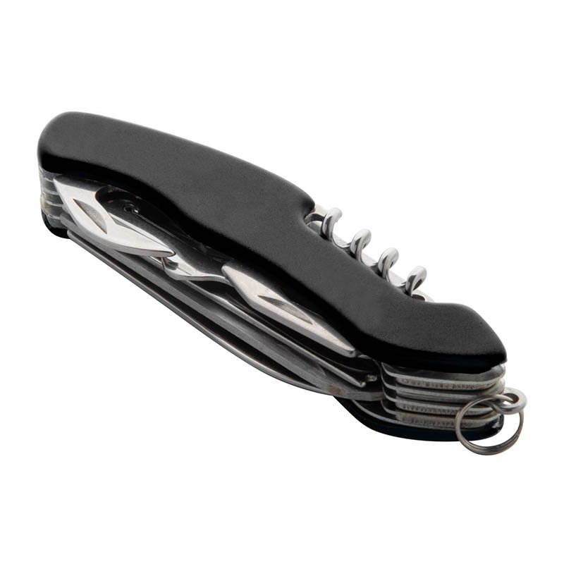 14-dielny vreckový nôž vyrobený z nehrdzavejúcej ocele, ktorý obsahuje: otvárač na konzervy, nožnice, odstraňovač háčikov na ryby, odstraňovač šupín na ryby, pílový nôž, nôž, štrbinový skrutkovač, otvárač na konzervy, krúžok na kľúče, vývrtk
