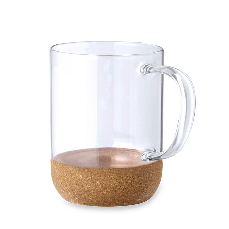 NOVINKA 2025. Borosilicate glass mug with 450 ml capacity. Distinguished design in a combination of glass and cork, in a variety of translucent colours. Presented in an individual box with kraft finish.Made with plant-based elements to promote the use of natural raw materials and reduce polluting emissions.Made of borosilicate glass, which offers exceptional strength and durability, extending lifespan and able to be reused countless times.