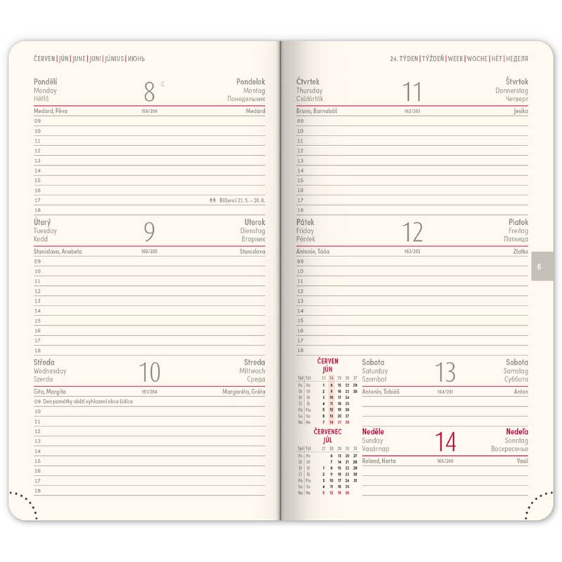 Nová řada diářů s výrazným letopočtem. Povrch má jemnou strukturu a je vhodný pro všechny typy ražeb. Týdenní rozložení s česko-slovenským kalendáriem a doplňkovou angličtinou, němčinou, maďarštinou a ruštinou.