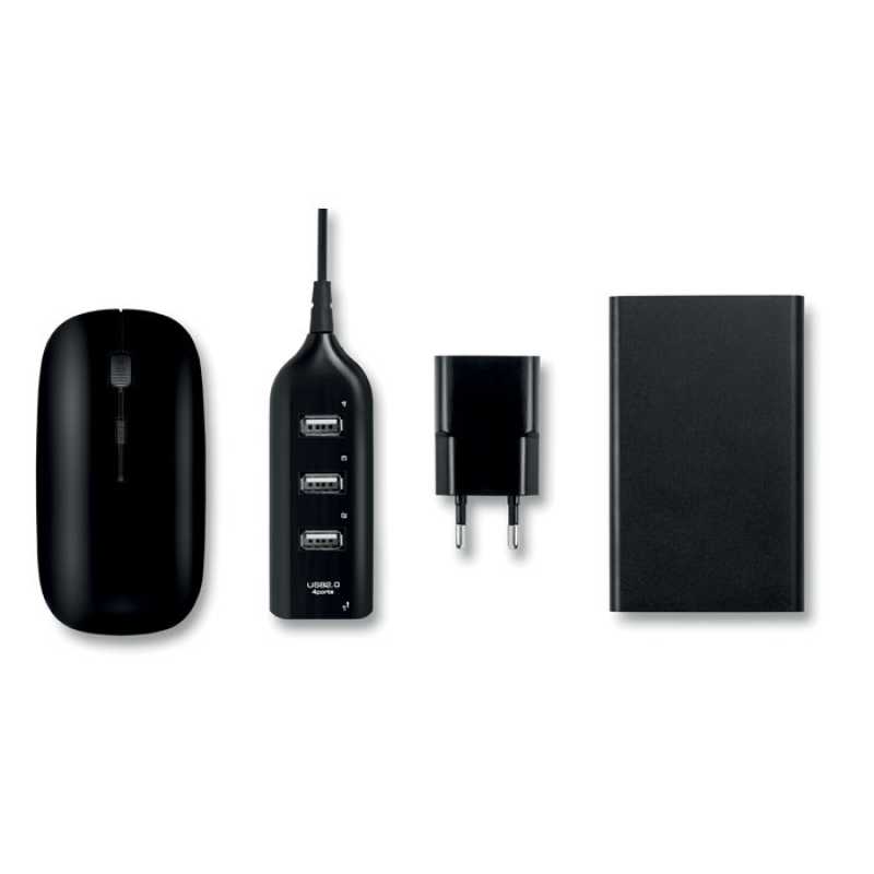 Počítačové příslušenství v EVA/PU pouzdře obsahuje: 1 bezdrátovou myš, 4 portový 2.0 USB hub, 1 EU zástrčku a 4000 mAH Power bank. Napájecí micro USB kabel.