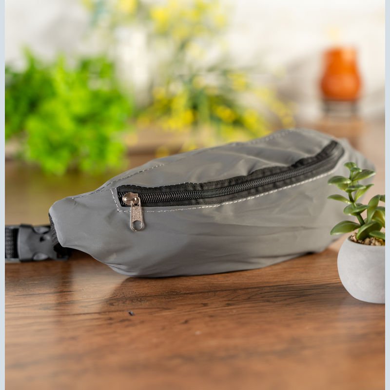 Polyester reflective waist bag with zipper. Including adjustable waistband.