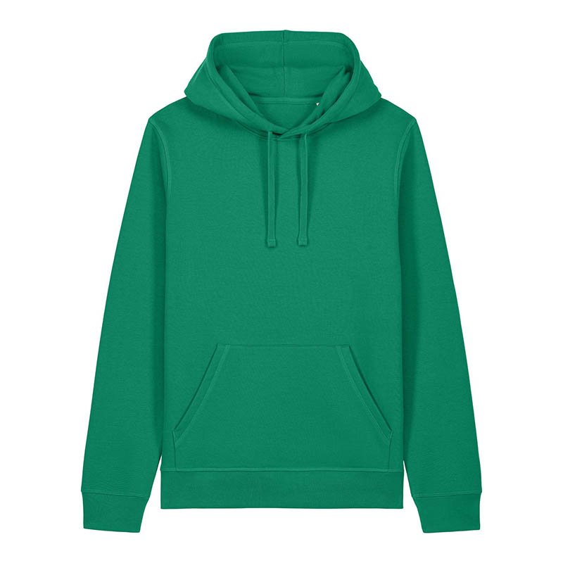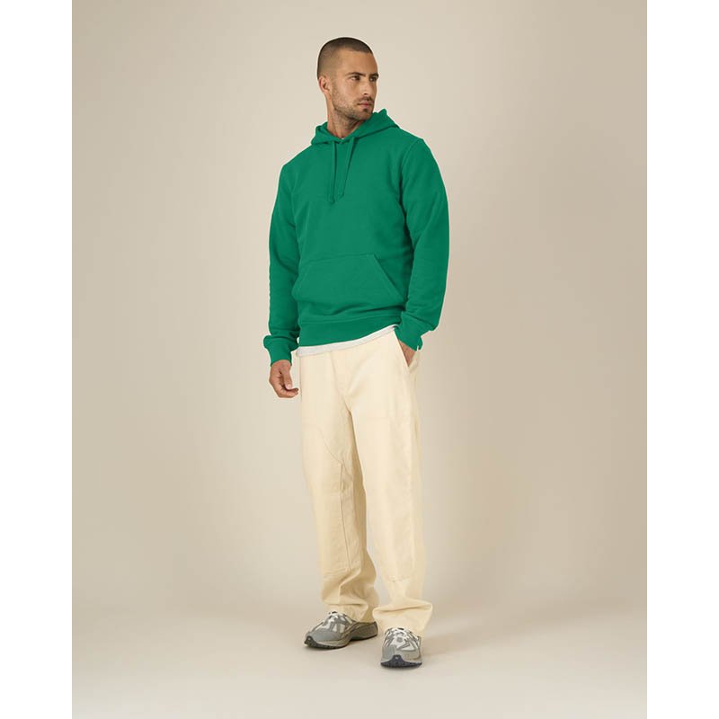 Bavlna s dlouhými vlákny. Kruhově dopřádaná bavlna. 3vláknitá tkanina pro hladký povrch. Dvouvrstvá kapuce. Žebrování s elastanem pro lepší stabilitu. Dvojité prošívání. Dvojité barvení. Česaná vnitřní úprava. Bez potisku lze prát při 60 °C