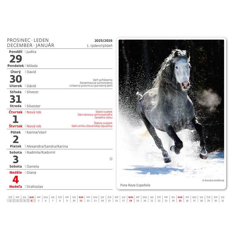 Kalendář Koně. Formát kalendáře: 17,1 x 13,9 cm. Kalendárium: české/slovenské týdenní řádkové. Počet stran kalendáře: 56 + 2. Stojánek: se zámkem. Prostor pro přítisk: 17,1 x 2,5 cm. Autor: Renáta Kolářová
