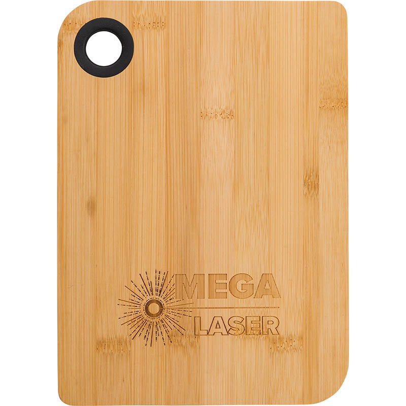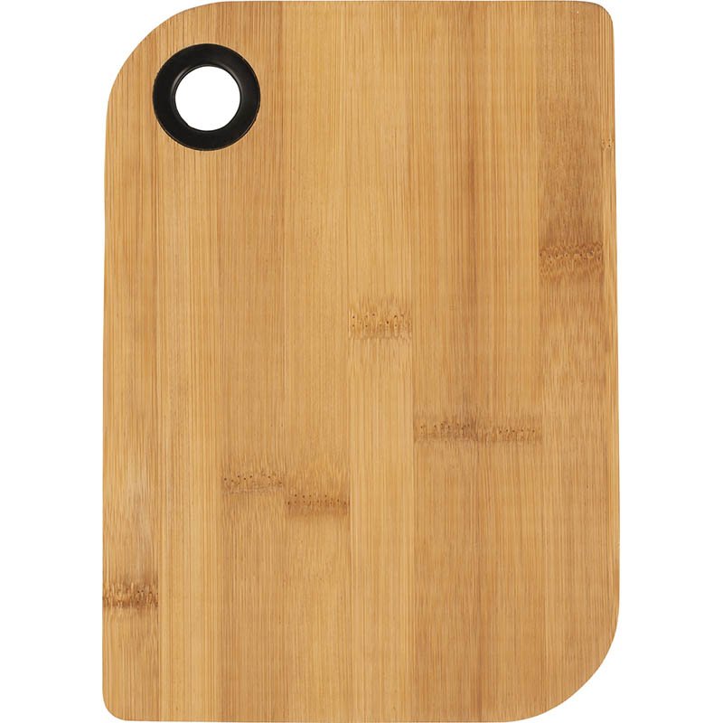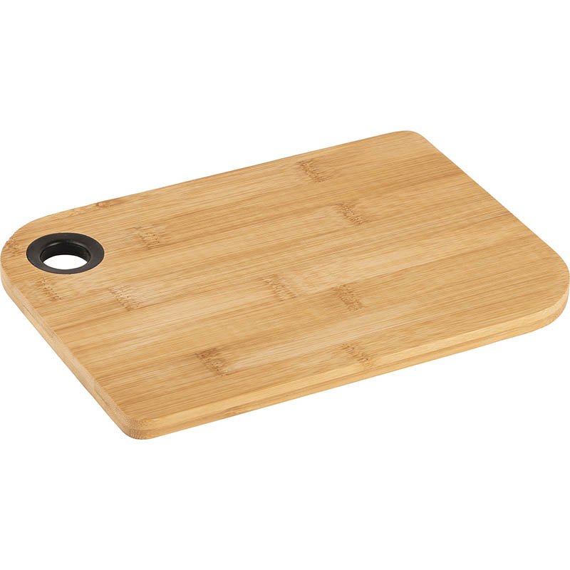 Bamboo cutting board. The thumb hole is lined with a silicone ring.