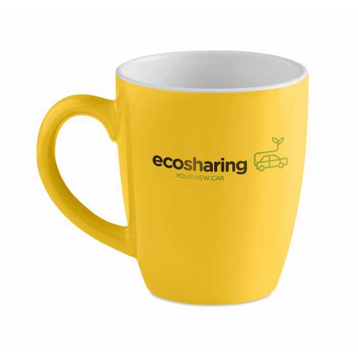 Ceramic mug (300 ml) with colour details. This item is especially suitable for sublimation print. Individually packaged in a gift box.