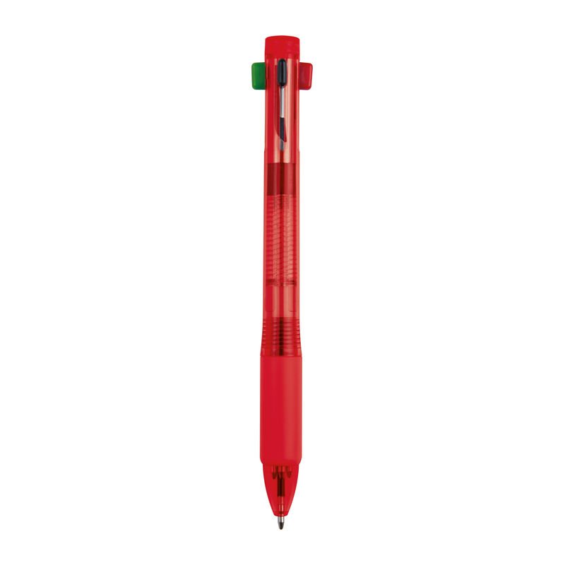 Plastové kuličkové pero se 4 barevnými tuhami (modrá, černá, červená a zelená).