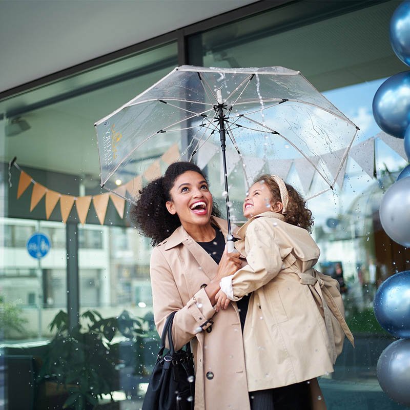 Convenient automatic function for quick opening, Windproof system for higher flexibility and stability in windy conditions, flexible fibreglass ribs, cover with special imprint on two panels, white rain cloud motif is visible in dry condition, coloured rainbow-motif becomes visible in wet conditions, dull black handle with promotional labelling option, higher corrosion protection due to galvanized steel shaft, awarded with marke(ding) Award 2012. Also available as mini umbrella (art. 5042C).