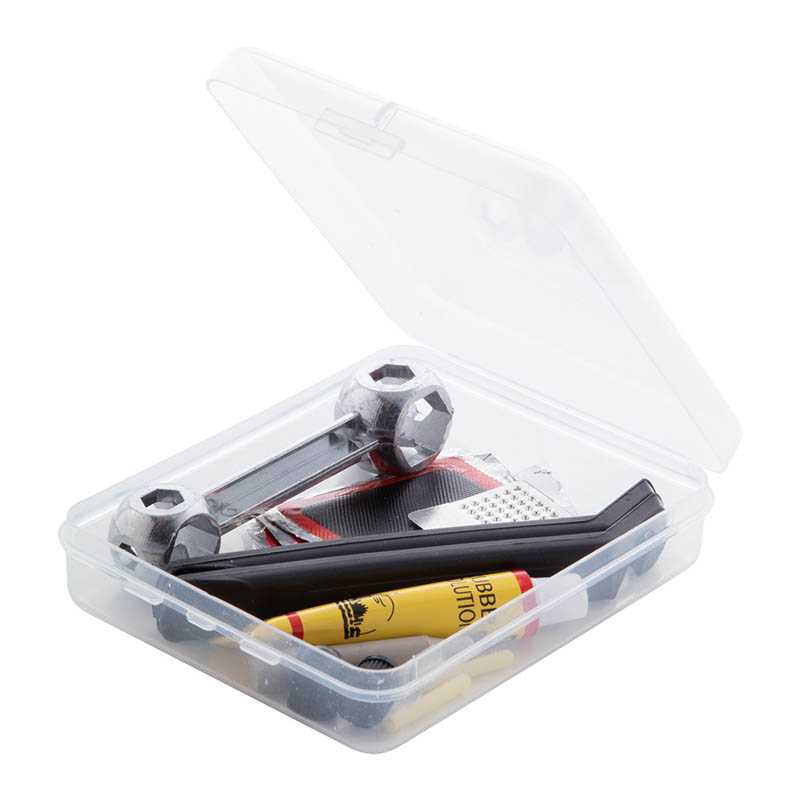 Sada na opravu jízdních kol v průhledném plastovém pouzdře z PP. Obsahuje šestihranný klíč a sadu na opravu defektu (2 páčky na pneumatiky, struhadlo, lepidlo, 2 krytky ventilů, 2 duše ventilků a 5 záplat na pneumatiky).