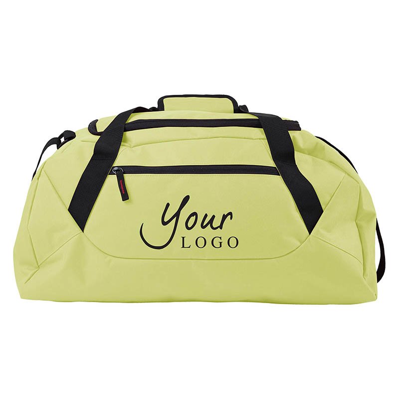 Polyester (600D) sports bag with a zippered compartment and adjustable carry strap.