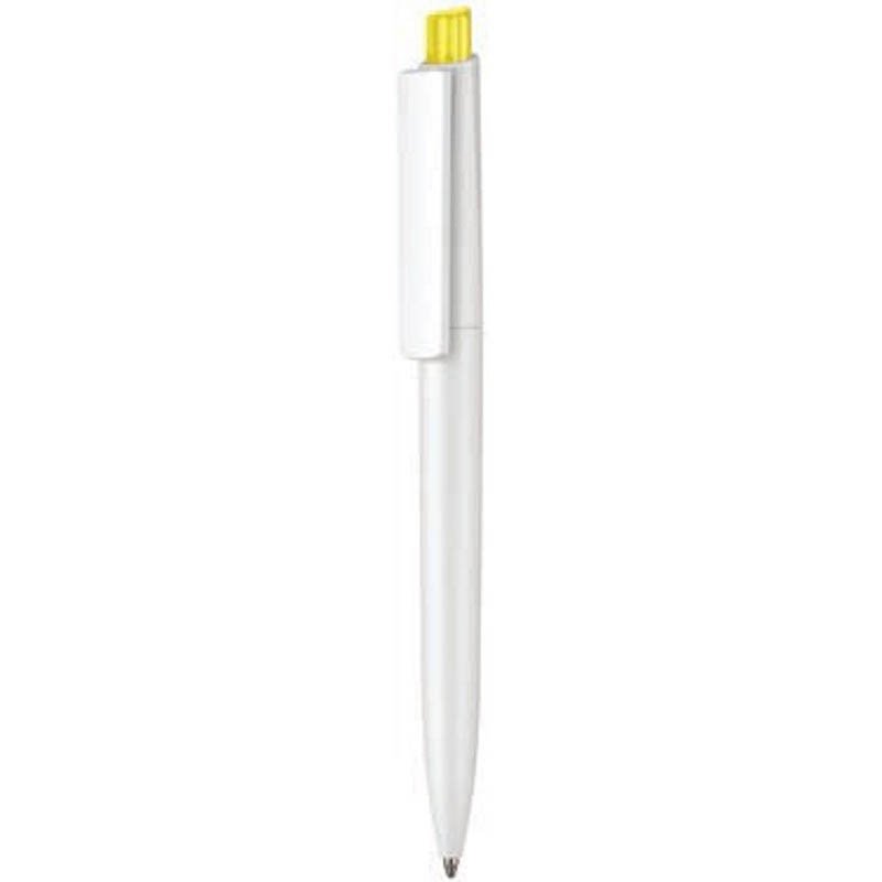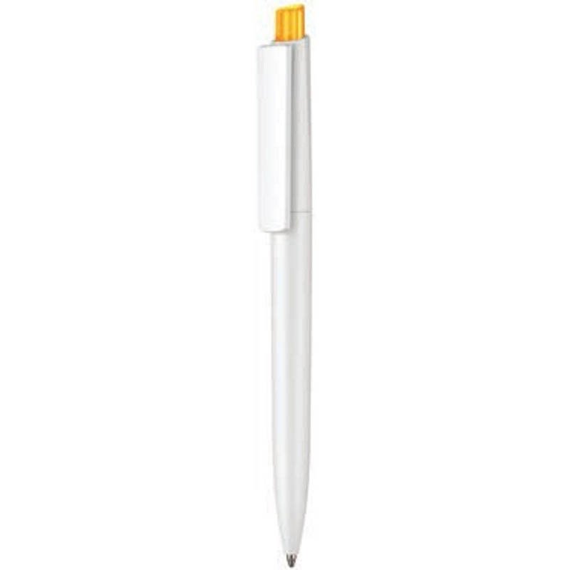 Stilolinea plastic ballpen with a white barrel, coloured accents. metal clip, and jumbo refill. Blue ink. Orderable per 1,000 pieces.