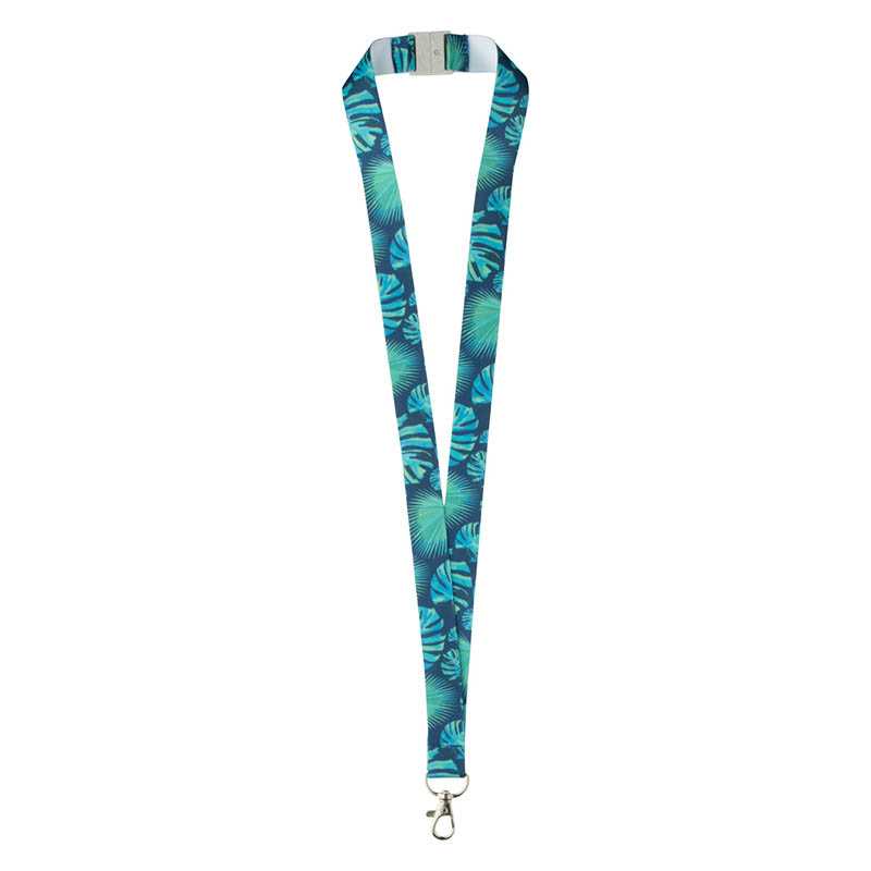 Polyesterový lanyard RPET na zakázku s kovovou karabinkou a bezpečnostní přezkou z pšeničné slámy, se sublimačním potiskem na jedné straně. Cena zahrnuje sublimační potisk, nezahrnuje tiskovou přípravu. Min. mn.: 100 ks.
