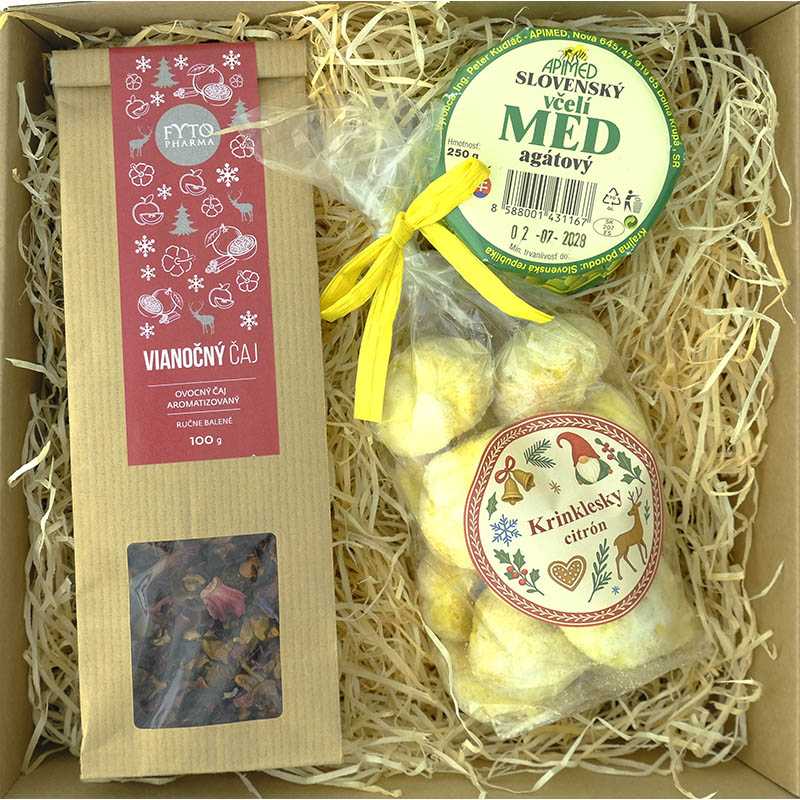Darčeková krabica > prírodná / prírodná > 21x21x10 cm, Krinklesky citrónové 150g, Vianočný čaj 100 g, Agátový med 250g amfora