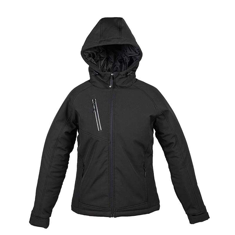 Softshell jacket 3 layers, waterproof and breathable - 97% polyester - 3% elastan - Waterproof 6000 mm/H2O - Breathability 4000 g/M2/24h - Thermic lining inside the front part - Reflective printing on front and back side - Raglan sleeves - Detachable padded-hood with drawstring - Laser cutting zip - One chest pocket with zip - Two pockets with zip - Inner wallet pocket - Elastic cuffs with velcro closing - Drawstring at the bottom