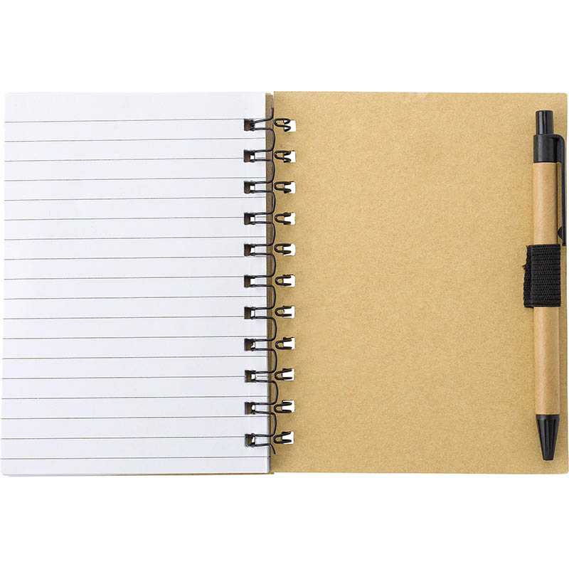Bamboo look notebook, wire bound, 70 lined pages, mulitple colours of sticky notes and ballpen with blue ink.