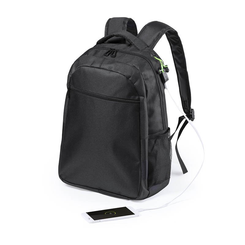 Voděodolný batoh s příhrádkami na zip, vypolstrovanou příhrádkou na laptop (15") a tablet (10"), vypolstrované ramenní popruhy. Výstup na sluchátka a s vestavěným USB připojením pro power banku. 600D polyester.