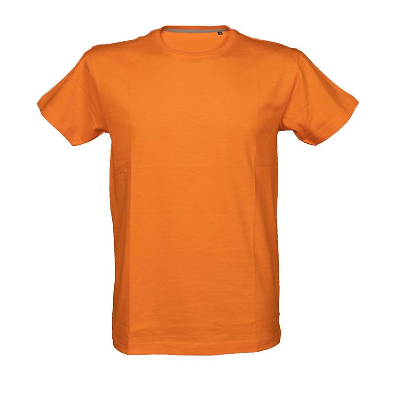 T-shirt round neck - 100% combed cotton - No label - Low neck (1.2 cm h Man, 0.8 Lady) - Tape inside collar in cool grey - 10 pieces folded in half, packed in one polibag - 5 pieces folded in half for color Army green, Avio, Orange - In each pack there is a single size - Individually sold too