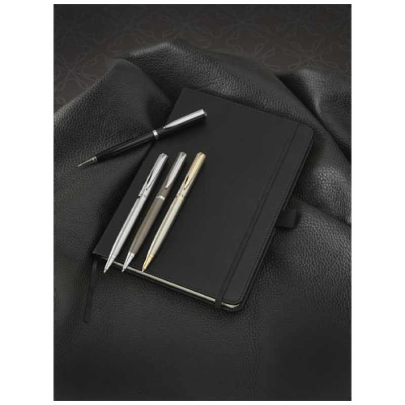 Dokonalá kombinace: poznámkový blok A5 PU s očkem na pero a kovovým stylusovým perem. Zabalen v dárkové krabičce. 160 listů papíru s gramáží 80 g/m2.