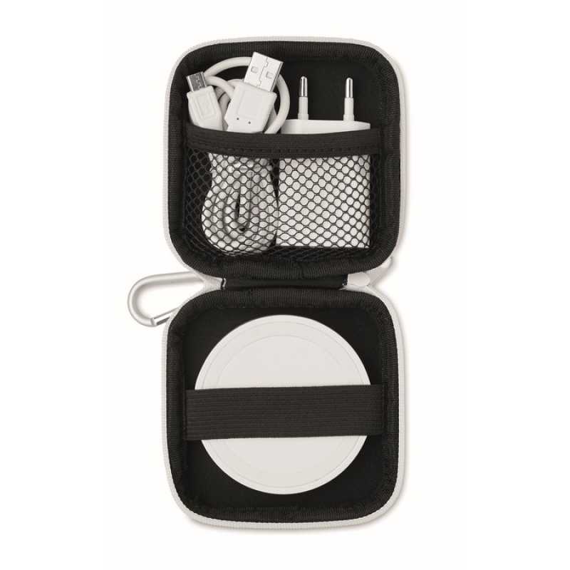 Sada bezdrátové nabíječky z ABS. Pouzdro z EVA / PU. Obsahuje EU zástrčku a nabíjecí kabel USB A na Micro B. Výstupní kapacita: DC9V/1.66A (15W).